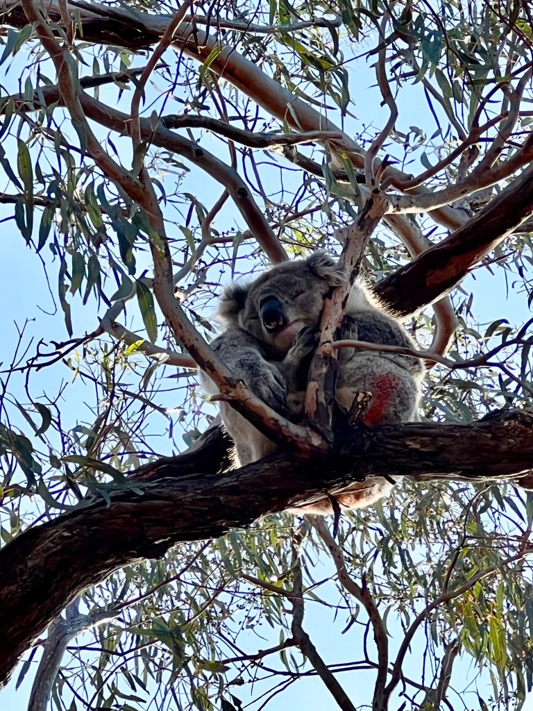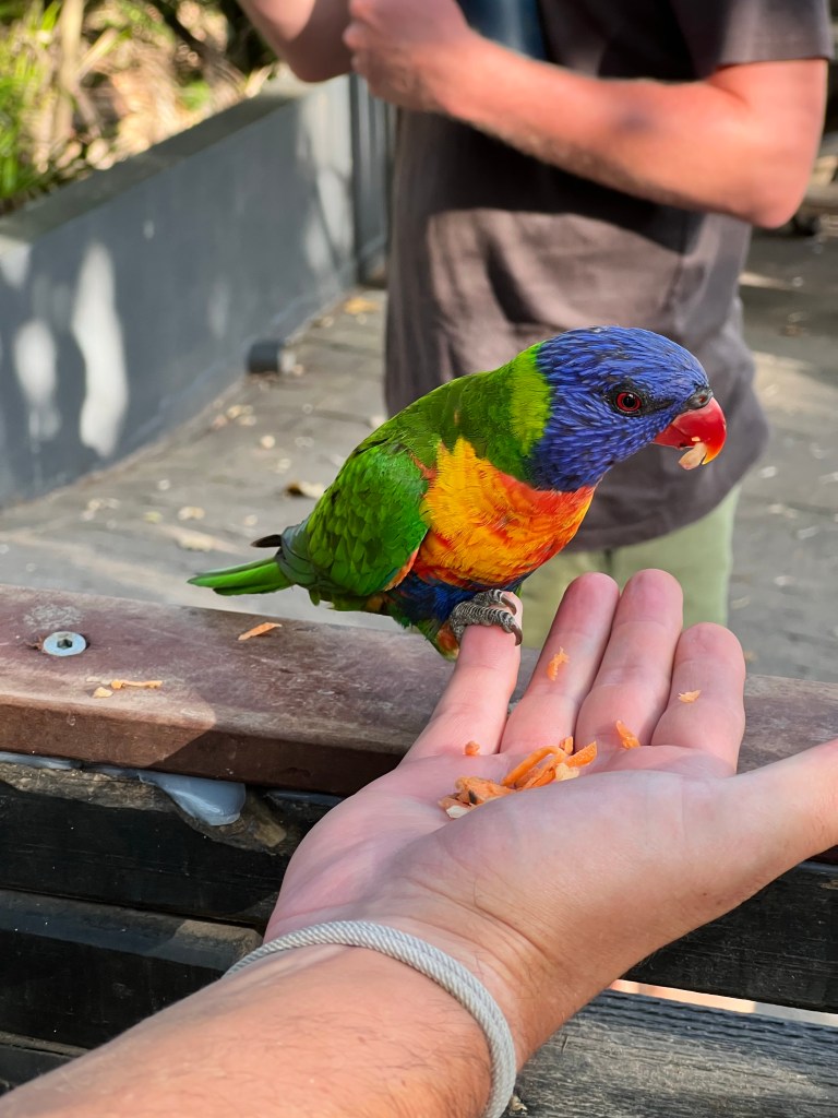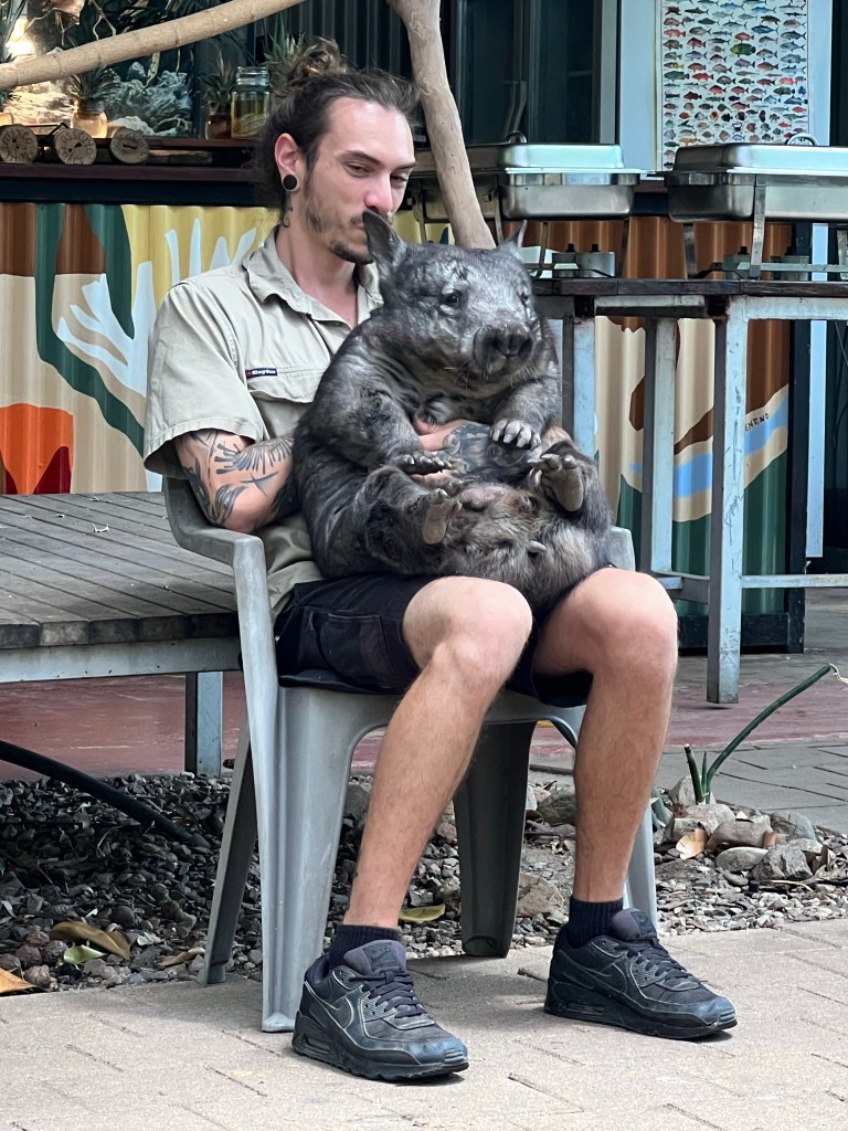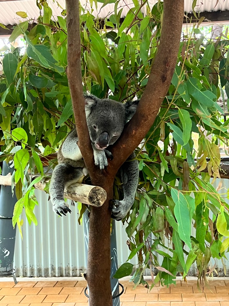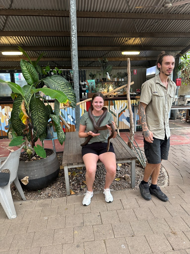 Auf dem Area des Hostels gab es auch einen Tierpark, bei welchem wir eine Tour buchten. Dort wurde uns einiges über Harry (ein Wombat), Thor, Pebbels und Amaroo (drei Koalas), Fish (eine Olive Python) sowie weitere Tiere erzählt. Harry, Pebbels und Fish durften sogar berührt und im letzten Fall sogar getragen werden. Ich verzichtete dankend auf das Tragen der Schlange und beschränkte mich auf das kurze Streicheln des geschuppten Tiers. Lena bewies da ein bisschen mehr Mut und liess sich die Schlage um die Schultern legen. Respekt.