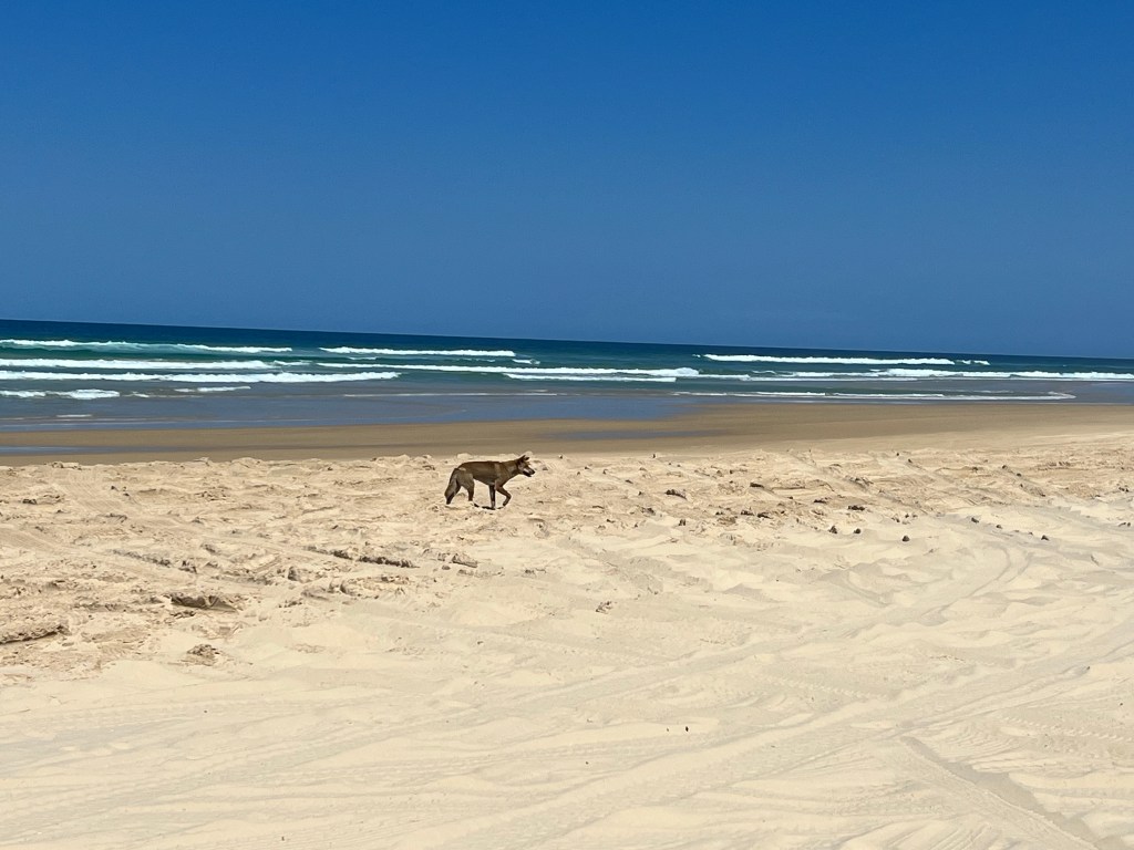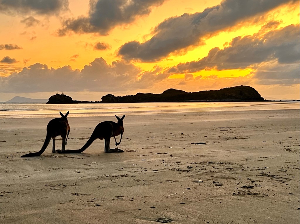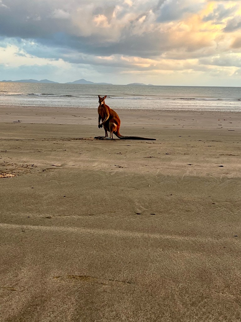 Nun aber zu den letzten Tagen in Australien. Nach Fraser Island (K‘Gari), welche uns ja sehr zugesagt hat, hatten wir nicht mehr viele Pläne. Ein Erlebnis, welches Lena unbedingt machen wollte, war den Sonnenaufgang mit Kängurus am Strand zu erleben. Dies kann man beim Cape Hillsborough machen. Im Vorfeld lasen wir, dass die Kängurus früher von Natur aus an diesem Strand bei Sonnenaufgang waren. Mit dem Zuzug von weiteren Menschen in die Region, nahm dies jedoch ab. Heute kommen zwar immer noch Kängurus und Wallabies an den Strand, aber nur aufgrund der Fütterung der Park Ranger. Dennoch war es ein schöner Anblick.