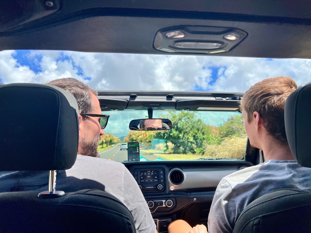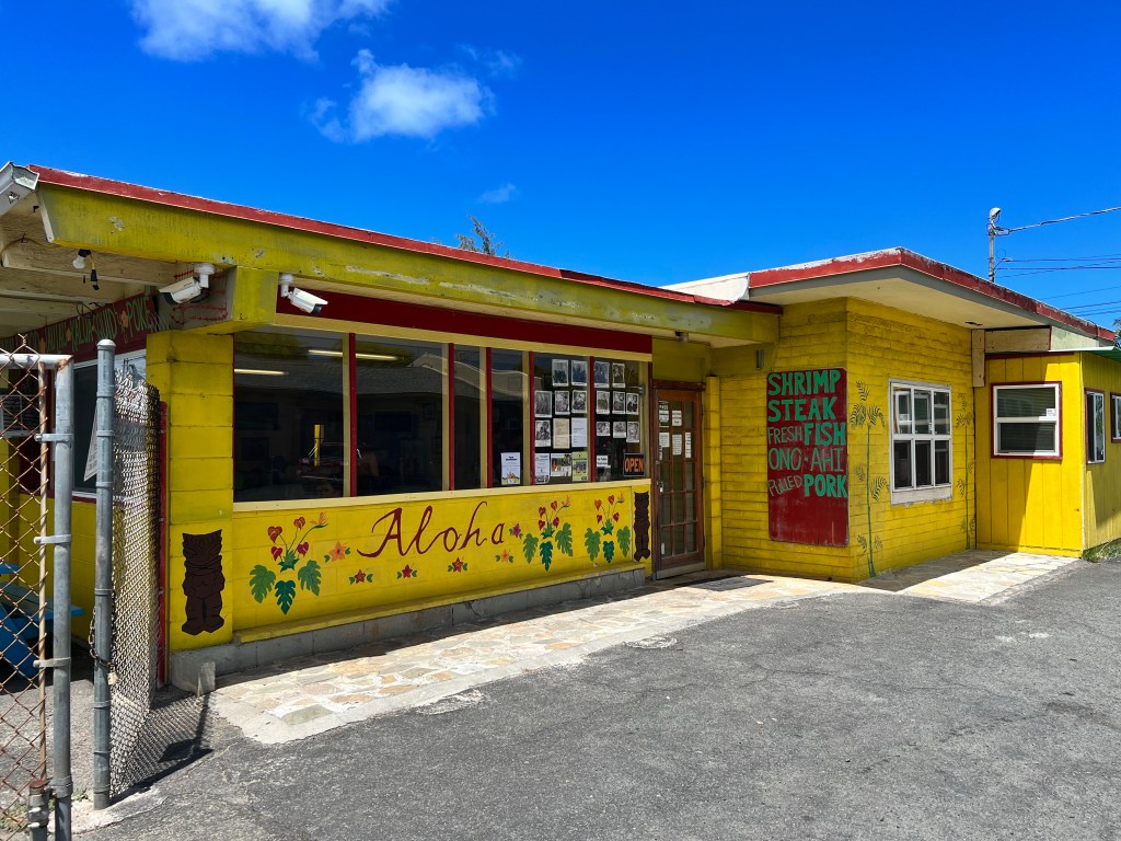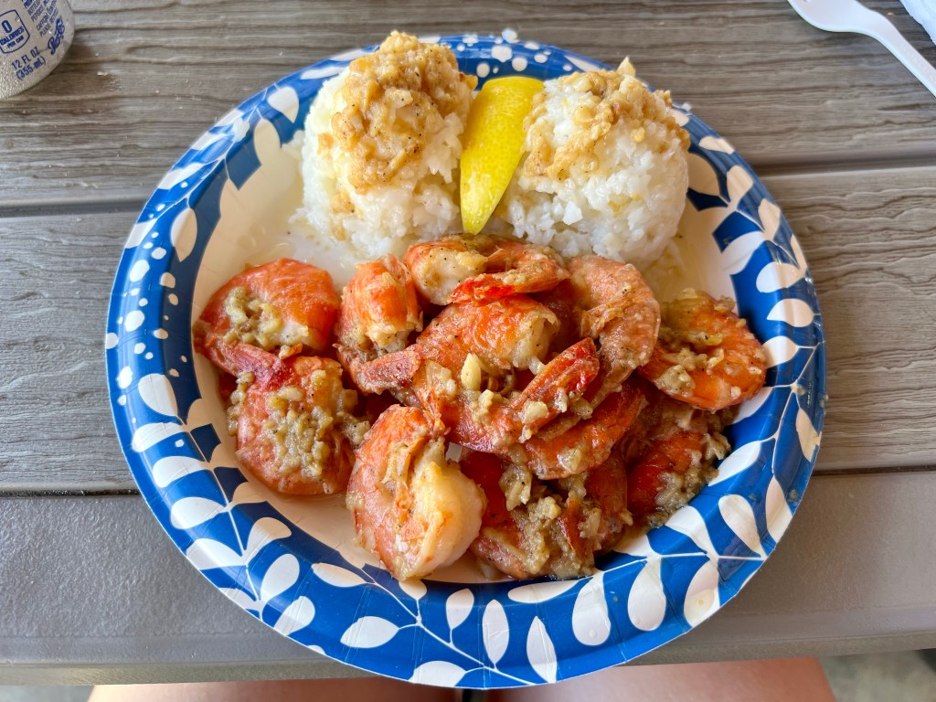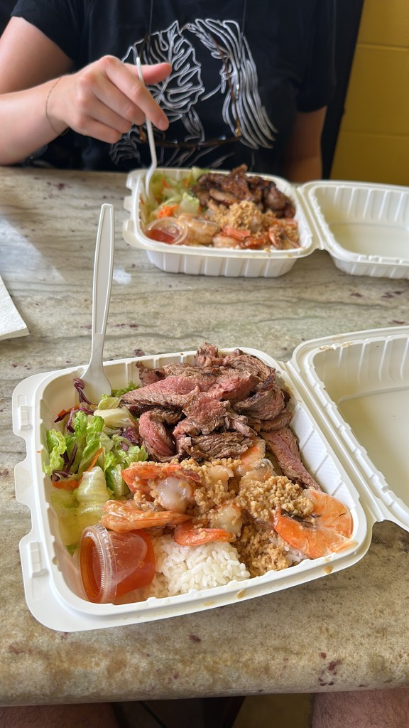 Für das Mittagessen fuhren wir wieder an der Ostküste hoch und besuchten ein kleines Lokal, welches hawaiianisches Essen servierte. Für uns gab es Shrimps mit Steak resp. Teriyaki Chicken, Reis und Salat. Köstlich.