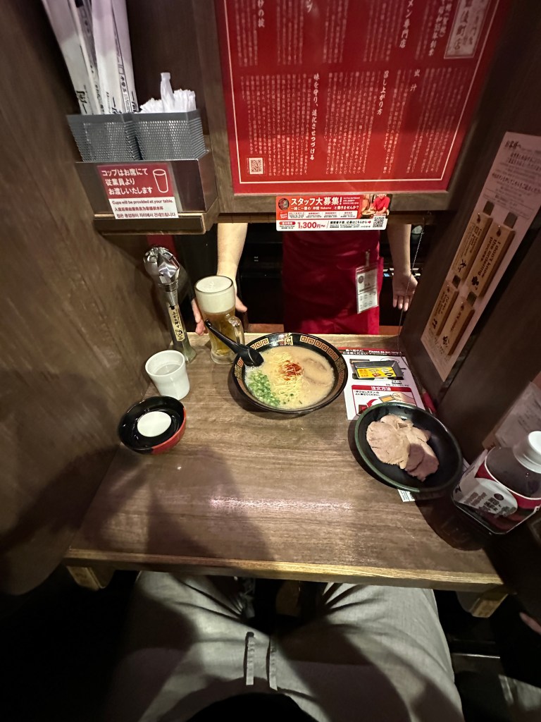 Die Art und Weise, wie man in gewissen Restaurants Ramen bestellt, ist uns nur aus Fastfood-Restaurants bekannt. An einem Automaten kann man die gewünschte Zusammensetzung der Suppe bestimmen. Dabei können neben Ramen auch andere Nudel, wie bspw. Udon, gewählt werden. Hat man dann seine Suppe, gilt es diese möglich schnell und schlürfend zu essen. Zumindest machen es die Japaner so. Dabei sprechen sie auch kein Wort und sind meistens nach wenigen Minuten bereits wieder fertig. Es gibt auch Lokale, in denen die einzelnen Sitzplätze mit Trennwänden von den anderen Gästen abgeschirmt ist. Zudem wird das Essen durch eine Luke gereicht, sodass man mit niemanden sprechen muss.